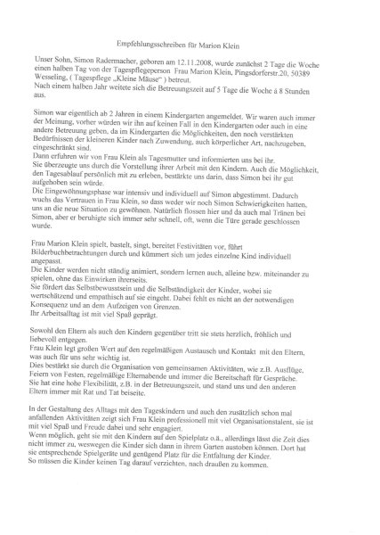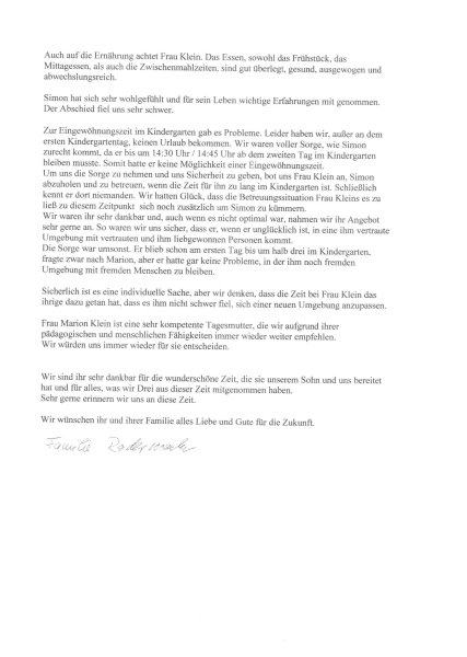Hier die Referenz der Eltern über meine Arbeit: